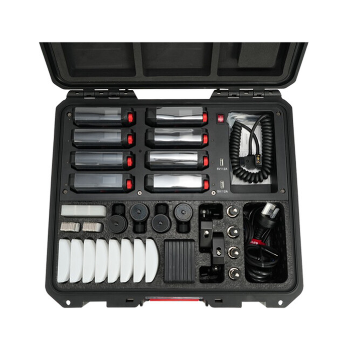 The MC Pro 8-Light Kit grants lighting professionals and rental houses with additional tools to store, charge, and rig an array of MC Pros as practical, accent, or fill lights within a scene. Being contained and charged in a sturdy hard-shell case, professionals will appreciate the ability to safely transport and store its included accessories. Featuring multiple sets of magnetic modifiers and mounting accessories, such as 1⁄4- 20in Articulating Arm to Clamp Adapters and 1⁄4-20in Screw to Baby Pin Adapters, the MC Pro 8-Light Kit is geared towards filmmakers and lighting technicians who need expanded mounting and modifier possibilities. For professionals on-the-move, the MC Pro 8-Light Kit can be powered using a D-Tap battery with the included cable, in lieu of of AC power.