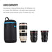 - Lens Capacity – Canon/Nikon/Sony 70-200mm 2.8 or Canon 100-400mm 4.5 (with hood reversed) and other zoom lenses up to 9 inches (23 cm).