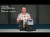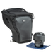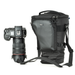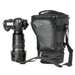 Unique holster developed specifically for a gripped camera body with a 24-70mm f/2.8 with the hood reversed. Popped-down, it fits a 70-200mm f/2.8 with its hood reversed.