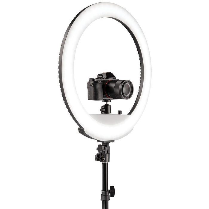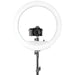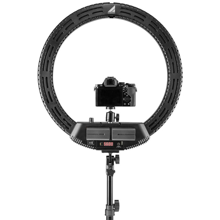 This ring light is fully dimmable and is equipped with an adjustable color temperature ranging from 3200K to 5600K in increments of 25 kelvin. With a high CRI of up to 97, light output is color accurate for perfect skin tones on-camera. The ring light’s display screen allows for making power and color temperature adjustments quickly with just a single dial.