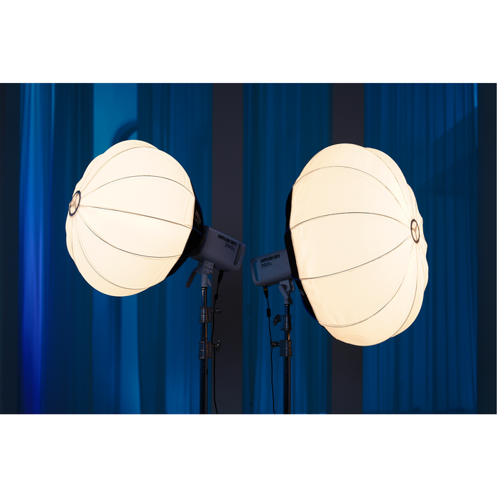 The amaran Lantern 90 is a 3ft (90cm) omnidirectional modifier built for filling larger spaces with soft, ambient lighting. Featuring a quick-build design, this wide, spherical light modifier transforms hard point-source LEDs into a soft, 360º lighting solution with a more even and expansive range for wide-angle shots and larger studio setups in seconds.