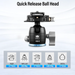 The design of the Sirui KS-5 Quick Release Ball Head streamlines shooting operations. It is compatible with SIRUI AT, T-0S and A series reverse folding tripods, allowing for easy storage, and the knobs can be adjusted freely to accommodate compact and lightweight equipment. Inspired by the SIRUI Rapid System, this head includes a side loading plate for quicker and easier installation. Additionally, it can be mounted with just one hand. To ensure safety, a bolt and flip lock are also included to prevent accidental equipment falls.