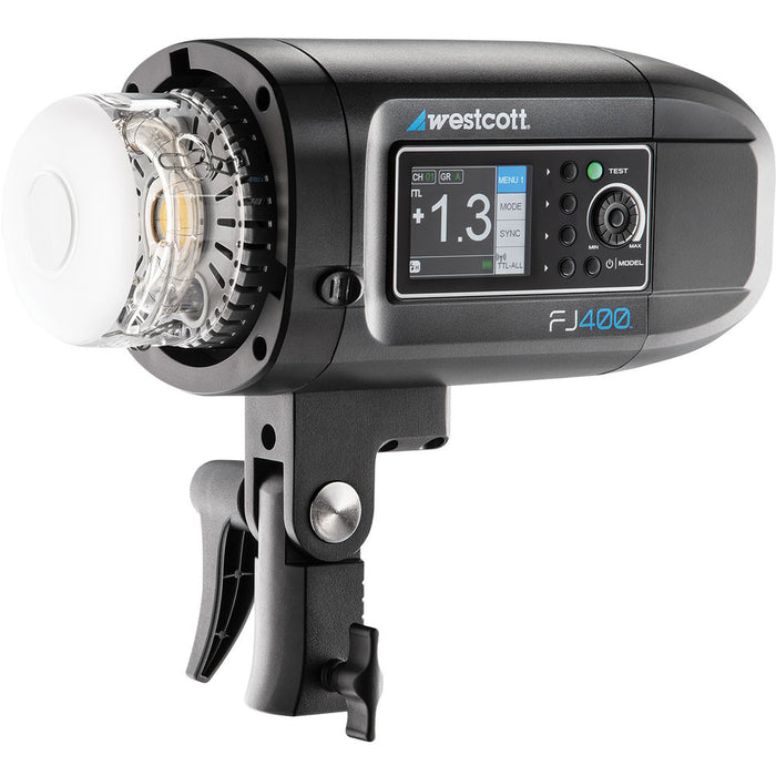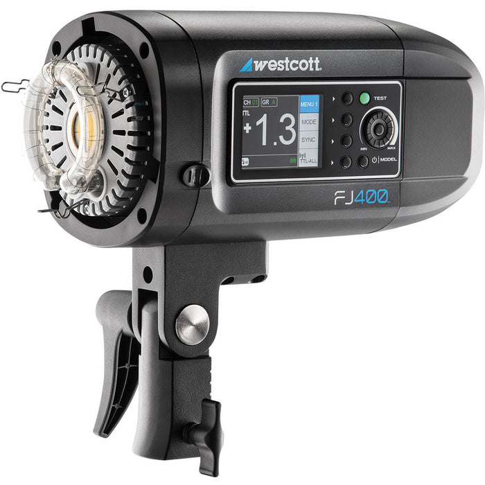The FJ400 maintains a color temperature stability of 5500K (±150K) throughout its entire 9-stop output range, with flash increments of either 0.1 or 1.0 stops. It features a 20W 5600K LED modeling lamp with auto-adjust and independent output control.