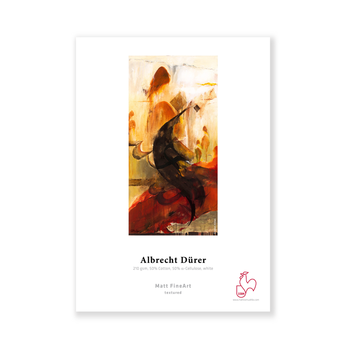 Hahnemühle Albrecht Dürer is a genuine mould-made paper made from 50% cotton and 50% α-cellulose fibers. The traditional mould-made art paper is refined with a coating specially developed for FineArt applications. The white FineArt inkjet paper does not contain optical brighteners and has a classic, strikingly defined watercolor structure that adds an artistic touch to art reproductions in particular. Combined with the matte premium inkjet coating, this produces impressive FineArt prints boasting vivid colors, deep black and optimum reproduction of detail. The acid- and lignin-free Albrecht Dürer FineArt inkjet paper meets the most exacting requirements for age resistance.
