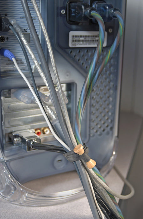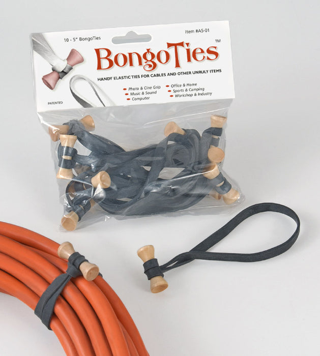 BongoTies are suitable for pro audio, video, photo, or any other application in which you need to keep coiled cables from unwinding into a mess of tangled spaghetti. BongoTies are sturdy, reusable, economical, and made of high quality natural rubber and bamboo, are elastic and feature a patented button-type closing construction. Each tie is 5" long. Pack of 10 black ties.