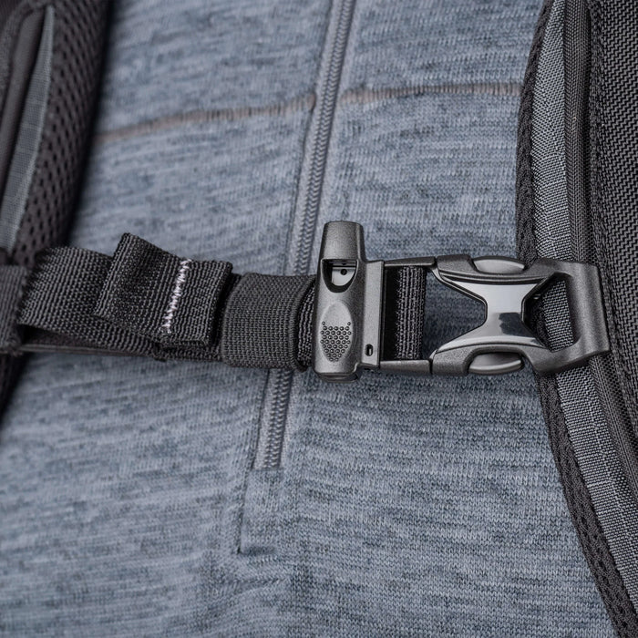 • Whistle integrated into sternum strap buckle