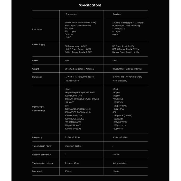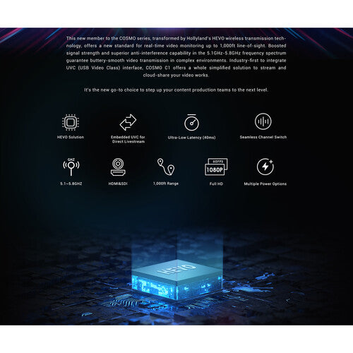 The Hollyland Cosmo C1 SDI/HDMI Wireless Video Transmission System offers a new standard for real-time video monitoring up to 1,000ft line-of-sight. Boosted signal strength and superior anti-interference capability in the 5.1 GHz-5.8GHz frequency spectrum guarantee buttery-smooth video transmission in complex environments. Industry-first to integrate UVC (USB Video Class) interface, COSMO Cl offers a whole simplified solution to stream and cloud-share your video works.