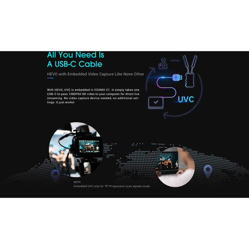 All You Need Is A USB-C Cable With HEVO, UVC is embedded in COSMO Cl. It simply takes one USB-C to pass 1080P60 HD video to your computer for direct live streaming. No video capture device needed, no additional set-tings. It just works!