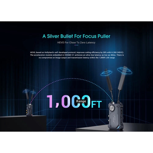 A Silver Bullet For Focus Puller HEVO, based on Hollyland's self-developed protocol, improves coding efficiency by 30% with H.265 (HEVC). The acceleration module embedded in COSMO Cl achieves an ultra-low latency as low as 40ms. There is no compromise on image output and transmission latency within the 1,000ft LOS range.