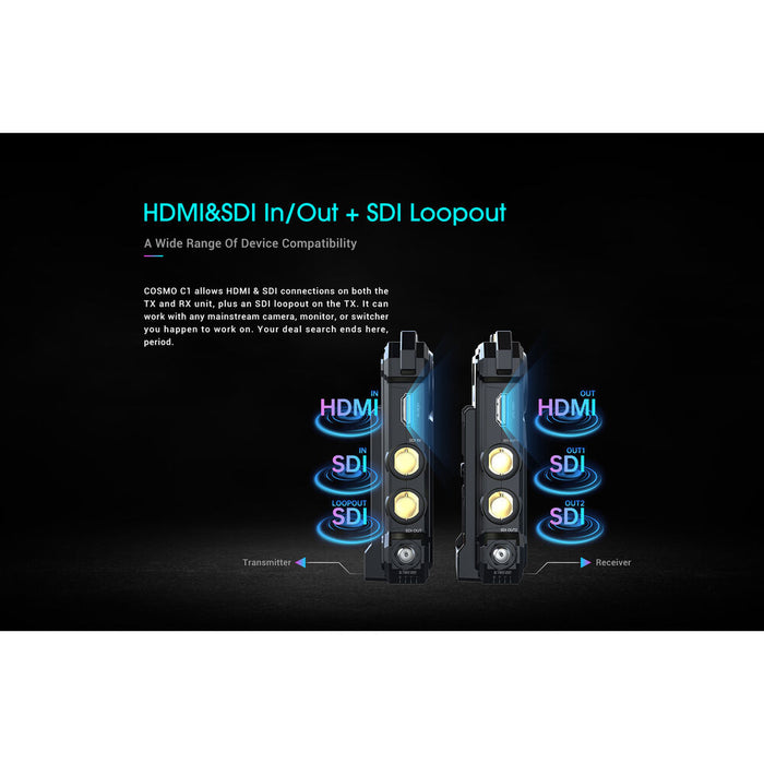 HDMI&SDI In/Out + SDI Loopout COSMO Cl allows HMI & SDI connections on both the TX and RX unit, plus an SDI loopout on the TX. It can work with any mainstream camera, monitor, or switcher you happen to work on. Your deal search ends here, period.