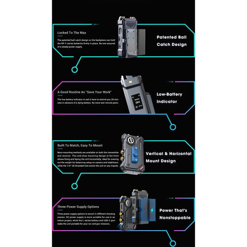 Vertical and Horizontal Mount Design Built To Match. Easy To Mount More mounting methods are available on both the transmitter and receiver. The cold shoe mounting design at the front allow fixing and laying the unit horizontally, idea for evening out the weight for balancing setup on camera and stabilizers, while the 1/4"-20 threaded hole erects the unit on any tripods.