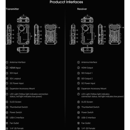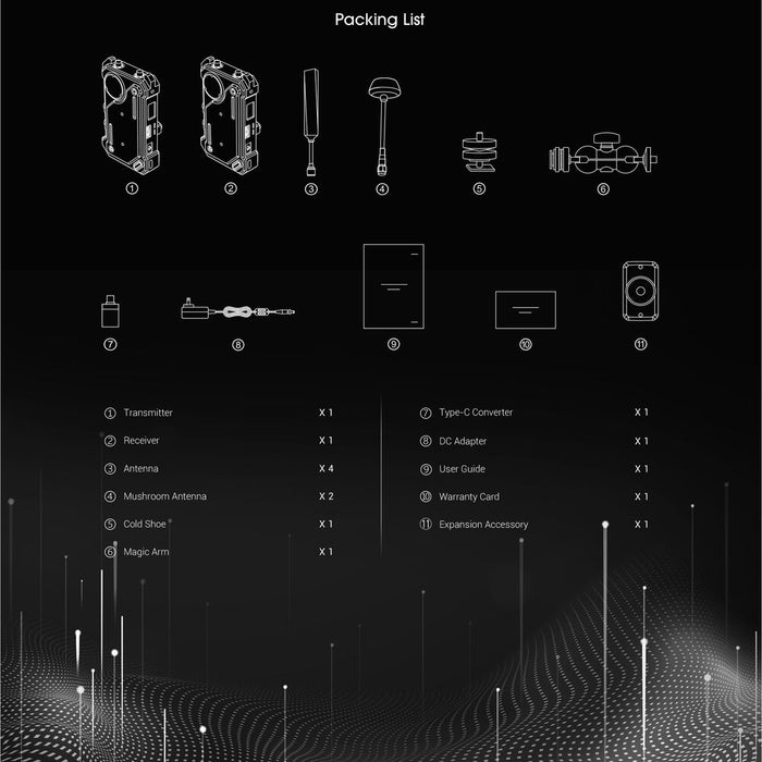 In The Box: Hollyland Cosmo C1 SDI/HDMI Wireless Video Transmission System 1 x Cosmo C1 Transmitter 1 x Cosmo C1 Receiver 4 x Antenna 2 x Mushroom Antenna 1 x Shoe Mount 1 x Pan/Tilt Mount with Shoe Mount 1 x USB Type-C Adapter 1 x DC Adapter 1 x Expansion Accessory