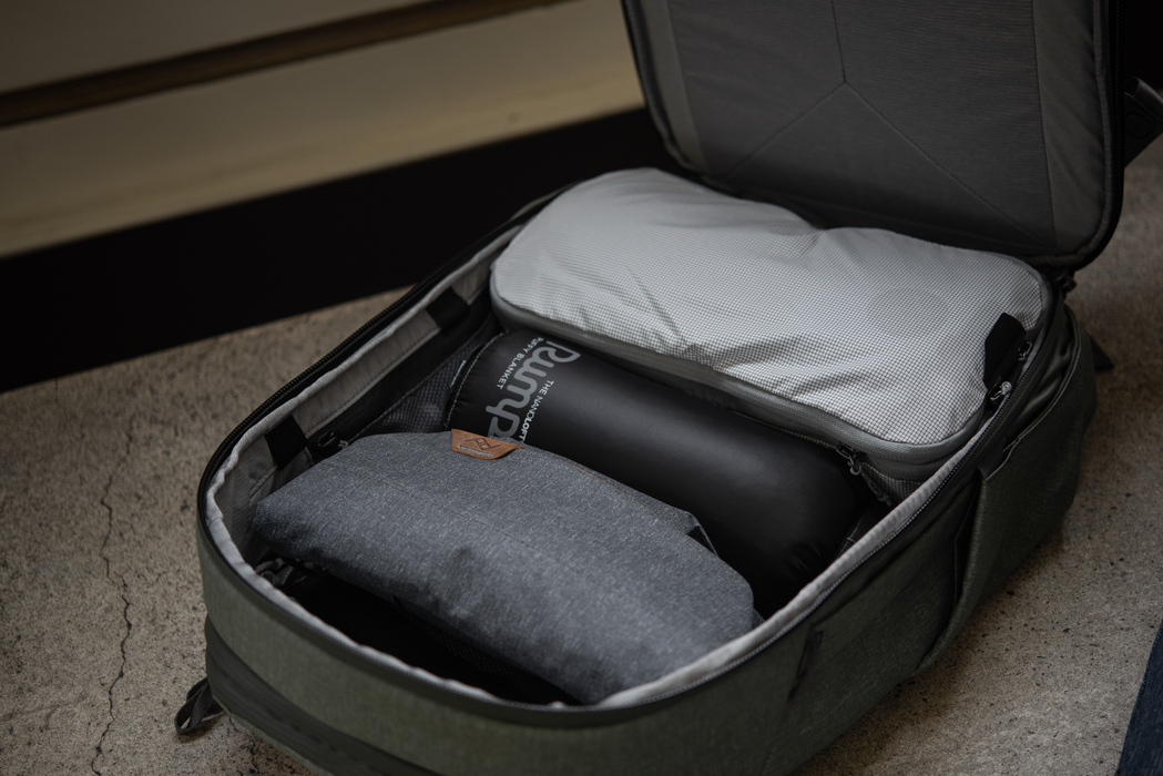 Works seamlessly with Peak Design Packing Cubes and Pouches, sold separately. Fits Peak Design Camera Cubes, but only in its expanded form. For optimal photo gear carry, we recommend the larger 45L Travel Backpack.