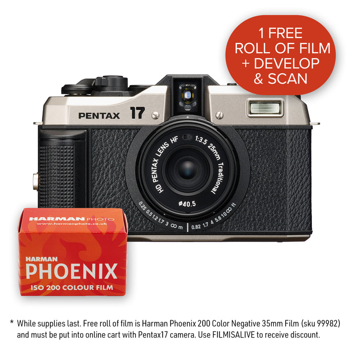 ADD TO CART the Pentax 17 camera, with a value of $50 or more of 35mm Single Roll Film, then add code HS25PENTAX to receive $50 off with purchase of the Pentax 17. While supplies last.