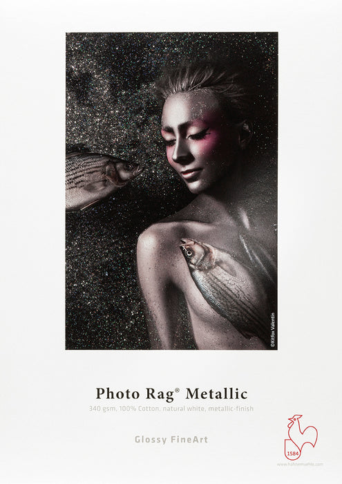 Hahnemühle Photo Rag® Metallic is a silvery-shimmering FineArt inkjet paper with a specially formulated inkjet coating for FineArt use. The natural white cotton paper contains no optical brighteners and has the characteristic Photo Rag® surface structure and sumptuous feel. Photo Rag® Metallic features a special silvery-shimmering surface finish. The high-gloss premium inkjet coating with a unique metallic effect guarantees impressive printing results with bold colours, deep black and the perfect reproduction of colour and detail. The sophisticated silver metallic effect underscores the image and makes motifs with metallic elements, reflections, ice and glass, architecture and landscape shots, as well as black and white photographs with high-contrast tones shine. Photo Rag® Metallic is acid and lignin-free and meets the most exacting requirements in terms of age resistance.