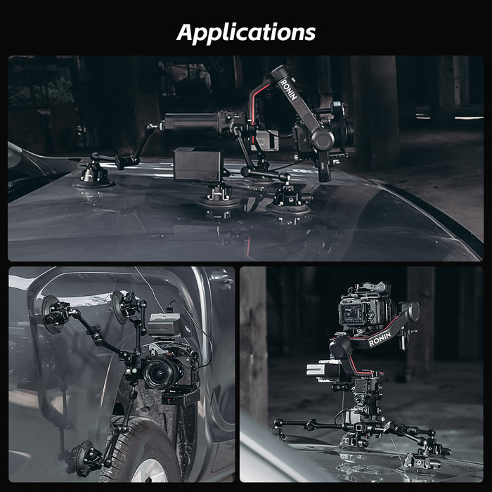 The kit consist of 4 suction cups, 4 x 11" magic arms, 1 lens support, 1 half ball head and 2 cable tethers. Among them, the suction cup quickly attaches magic arm via a NATO clamp to prevent twisting; the half ball head, which is -8°/+8° adjustable, supports Arca-Swiss and DJI RS stabilizer quick release plate for quick switch between car, handheld and stabilizer shooting; and the cable tether ensures your gear is safe.