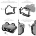 - 1/4"-20 threaded holes, ARRI 3/8"-16 locating holes; cold shoe mount, NATO rail, QD socket support handle, microphone, LED video light, monitor, etc.