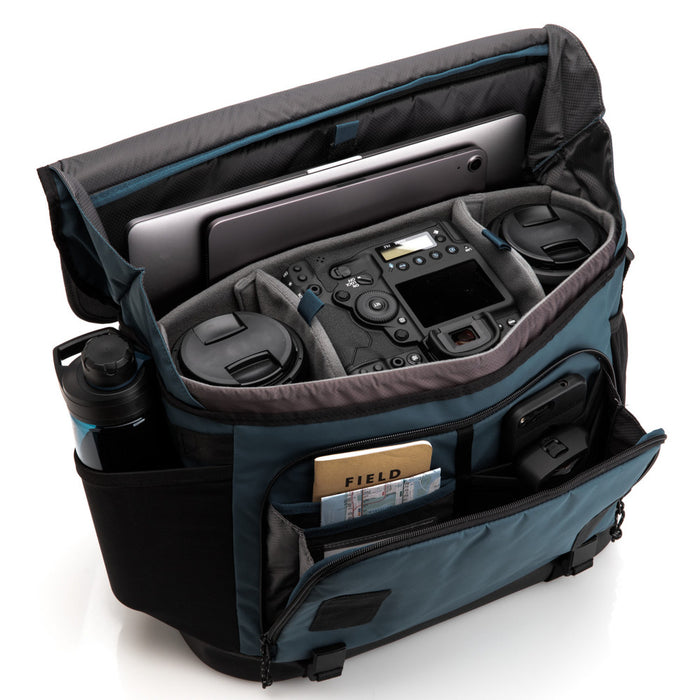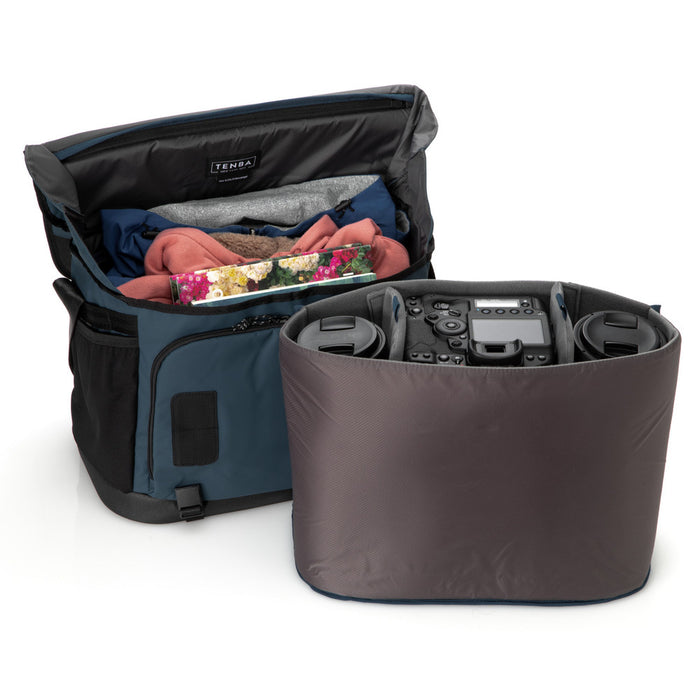 The Tenba DNA 16 Pro Messenger Camera Bag fits a mirrorless or DSLR camera (up to Pro size w/ grip) with 4-6 lenses (up to attached 70-200mm 2.8) plus flash and accessories, along with a laptop up to 16 inches (40 cm) and a tablet up to 11 inches (28 cm) such as the iPad 11 Pro. It was built for seamless transitions between photojournalism and sports photography, urban exploration and adventure travel, and every conceivable kind of social event. If there was ever "one bag to rule them all," this is it. The DNA Messenger is often imitated, never duplicated, and always ready for work. It features a Quick Access top zipper, a seam-sealed and completely waterproof bottom, Tenba's signature Whisper-Hook quiet closure, and a removable camera insert.