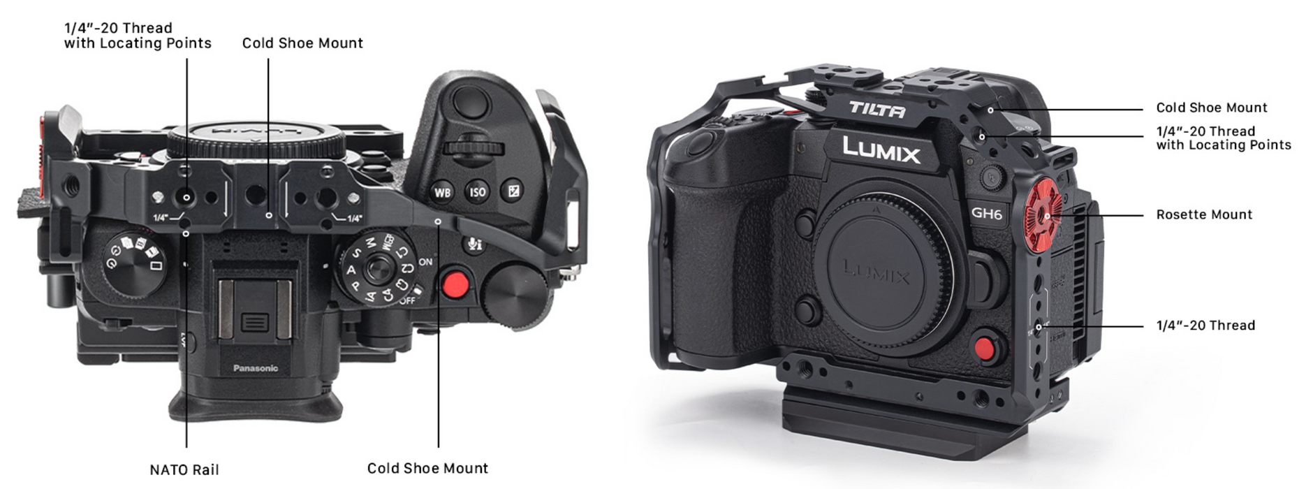 The cage features multiple cold shoe receivers, a Rosette Connection and 1/4”-20 threads with and without locating pins.