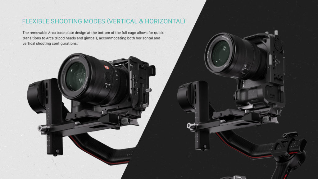 The cage features a removable ARCA-Swiss bottom plate which allows for quick transitions between tripod heads and gimbals like the DJI Ronin RS2 & RS3 Pro.