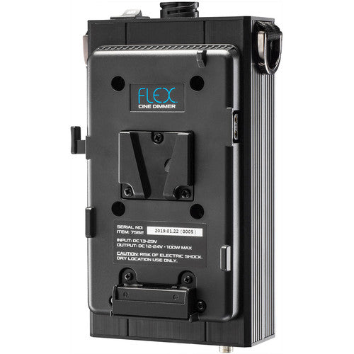 This dimmer can be powered with the included in-line AC Adapter, Flex Cine Wireless DMX Dimmer AC Adapter, 14.4-26V V-mount battery, or D-Tap battery via D-Tap to D-Tap cable.