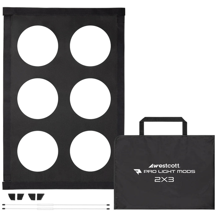 The black fabric attachment, similar to an egg crate grid, is made of a durable material that ensures long-lasting use. Each mod is lined using thick 1.5" hook-and-loop tape and has an adjustable corner system, allowing it to fit securely on a variety of softboxes and establish a light-tight seal. Adjustable tension rods have been incorporated to help ensure the light shape remains consistent throughout your shoot.